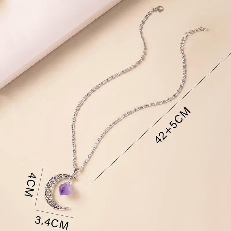 The stones are carefully set within the moon-shaped pendant, creating a striking contrast against the polished surface of the moon, and offering a dynamic blend of beauty and energy. Whether you're drawn to the calming properties of amethyst or the protective qualities of purple agate, each stone enhances the necklace's allure.