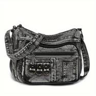Featuring a solid color washed denim look in Black, Blue, or Light Brown, it pairs beautifully with jeans, boots, oversized knitwear, and warm seasonal layers. The bag closes securely with a zipper and has a smooth polyester lining, making it perfect for daily essentials, commuting, uni, or weekend outings.