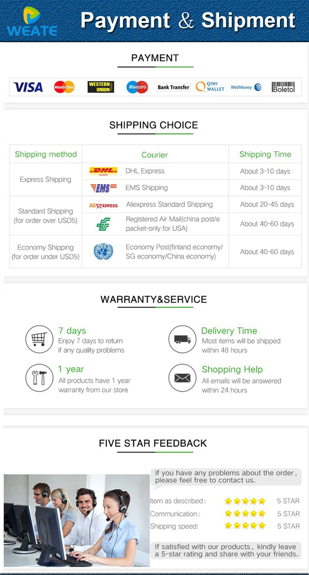 About Dropshipping service: We provide consignment services for a large number of customers. 1: We provide free warehouse storage, all your orders will be shipped within 24 hours, and we have no holidays. 2: We bear most of the after-sales problems (loss of logistics, damaged parcels, product quality problems, etc.) 3: No matter what product you are selling, we will provide service and we will give you a perfect quotation. 4: We accept payment in any way, and also accept forms to process orders. |