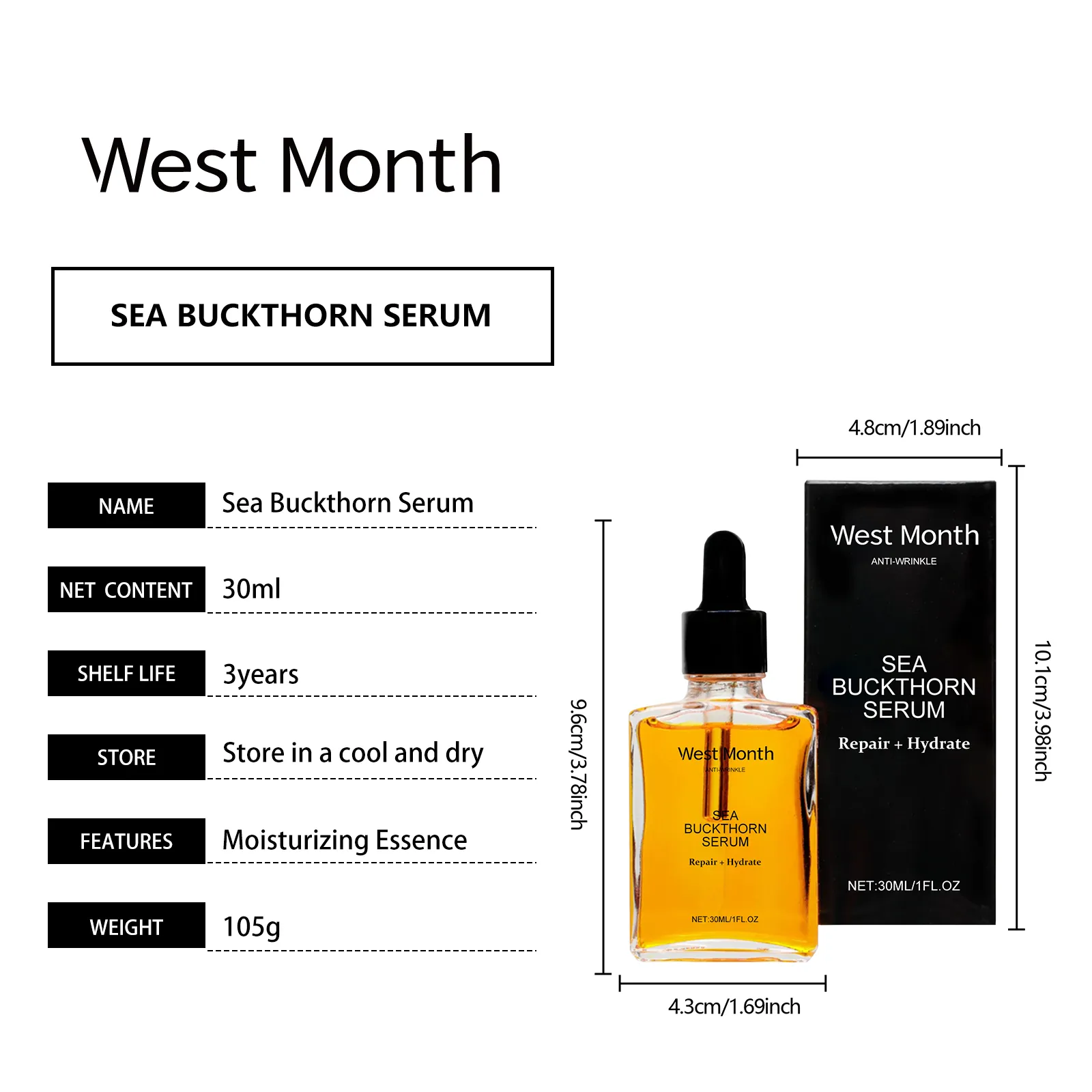 Our sea buckthorn moisturizing serum contains sea buckthorn fruit extract and hyaluronic acid. It helps skin retain moisture and leaves skin soft and smooth. Its use method is very simple: clean your face, take appropriate amount of this product evenly spread on the face, massage in circles to promote absorption. And can improve skin elasticity and firmness.
