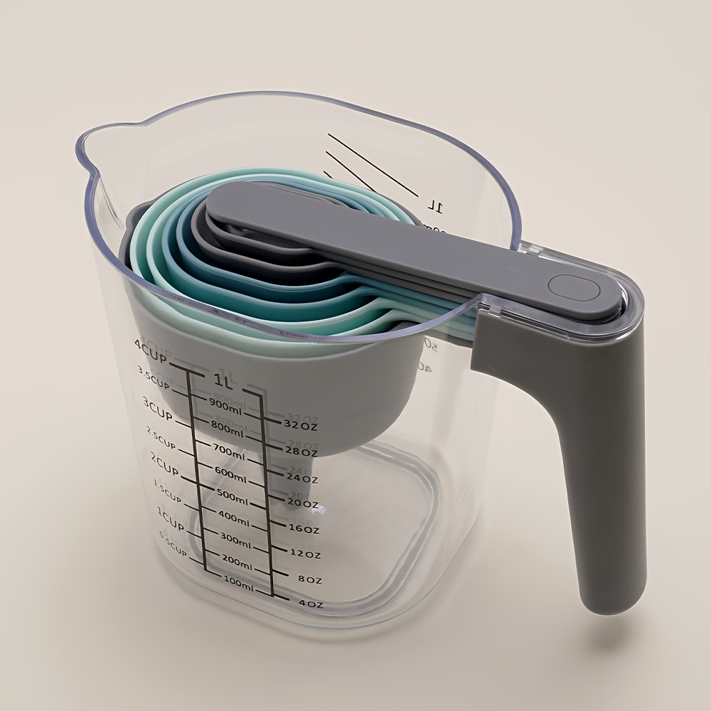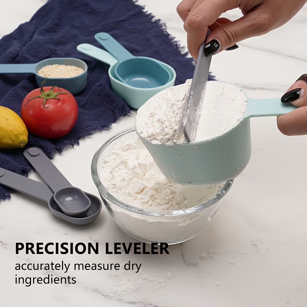 Includes stackable measuring cups, measuring spoons, funnel, and scraper for full kitchen accuracy.