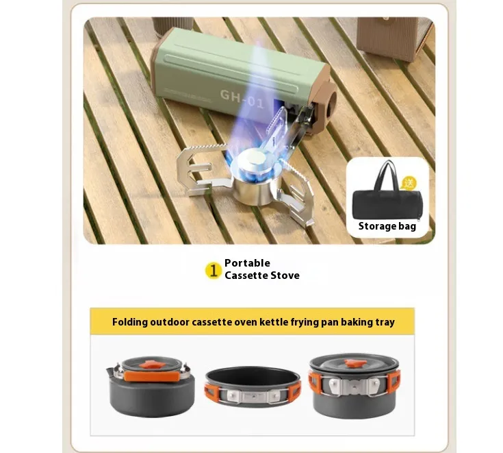 Storage belt *1, folding outdoor cassette oven *1, kettle *1, frying pan *1, baking pan *1.