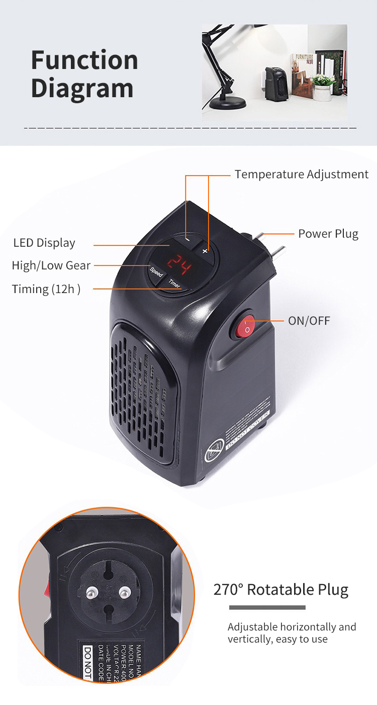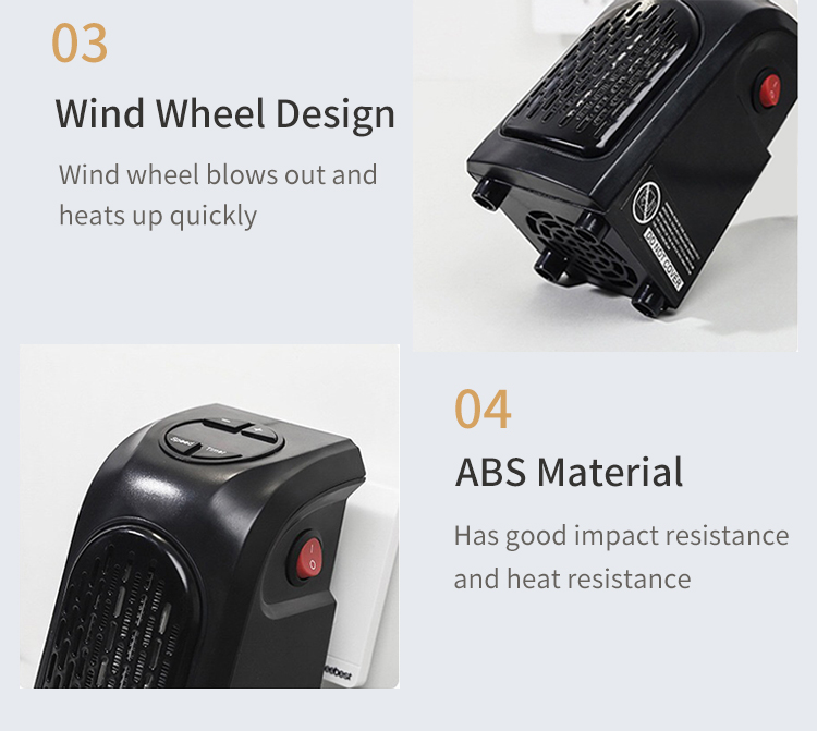 1. The fan heater is built with PTC ceramic heating element, using electric heating, raising the temperature in the room quickly and safely