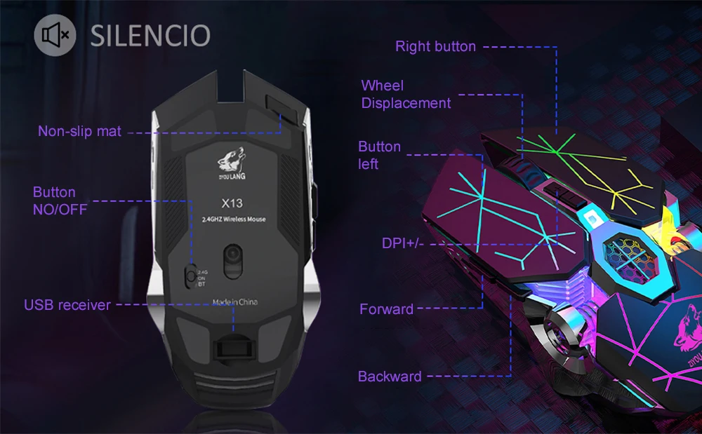The special silent design of the left and right buttons helps you create a quiet environment without disturbing others. The 7 soft LED colors alternate and cannot be set to a specific color or turned off.