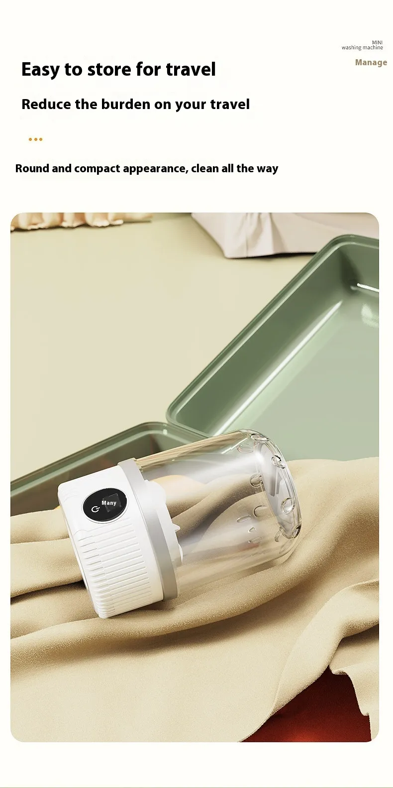 In a dorm, hotel, or small room, the Drabo Washer keeps your clothes fresh.Just add water, press a button, and