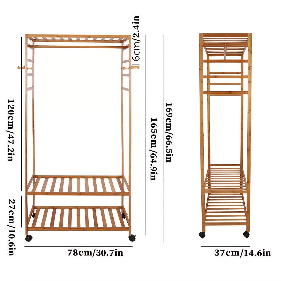 Specification Material: Phyllostachys Pubescens Color: Wood Weight: 6.4kg/14.11lb Size: 80 x 35 x 165 cm/30.91 x 15.75 x 66.34 in (L x W x H) The Distance Between Bottom Shelf and Medium Shelf: 29cm/11.42in Side Hanger Length: 2.36 inches Package Size: 90 x 43 x 14cm/35.43 x 16.93 x 5.51in (L x W x H) Bottom shelf: 20kg Hook bearing weight: 5kg Top bearing: 10kg