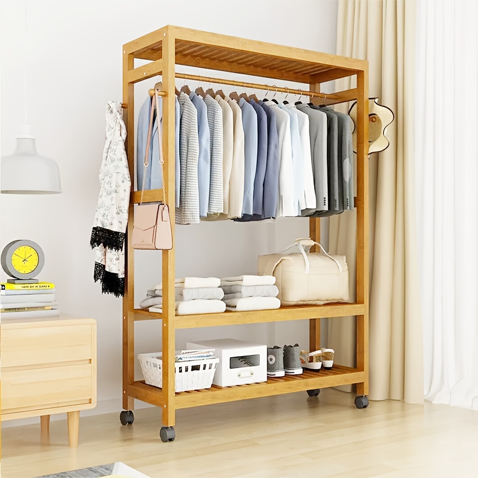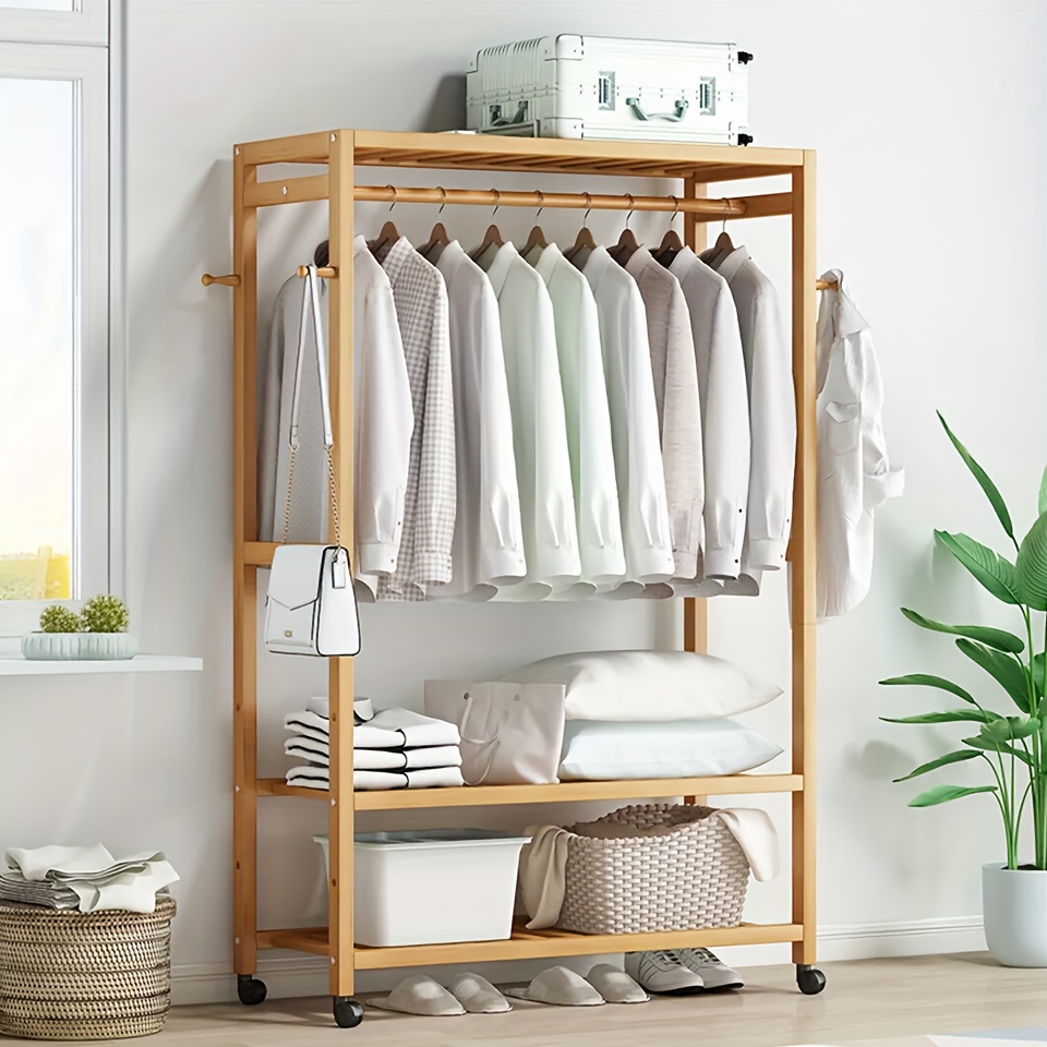 This wood clothing rack is made of solid natural wood features a fresh style. This 3-tier clothes rack with a hanging rod, side hanging hooks and 2 shelves, makes it easy to organize all your clothing shoes and bags and scarfs and so on. This rack with 4 rolling wheels for easy moving and lockable wheel for staying still. With this heavy duty garment rack makes your home into the organized clean neat tidy place you ever expected