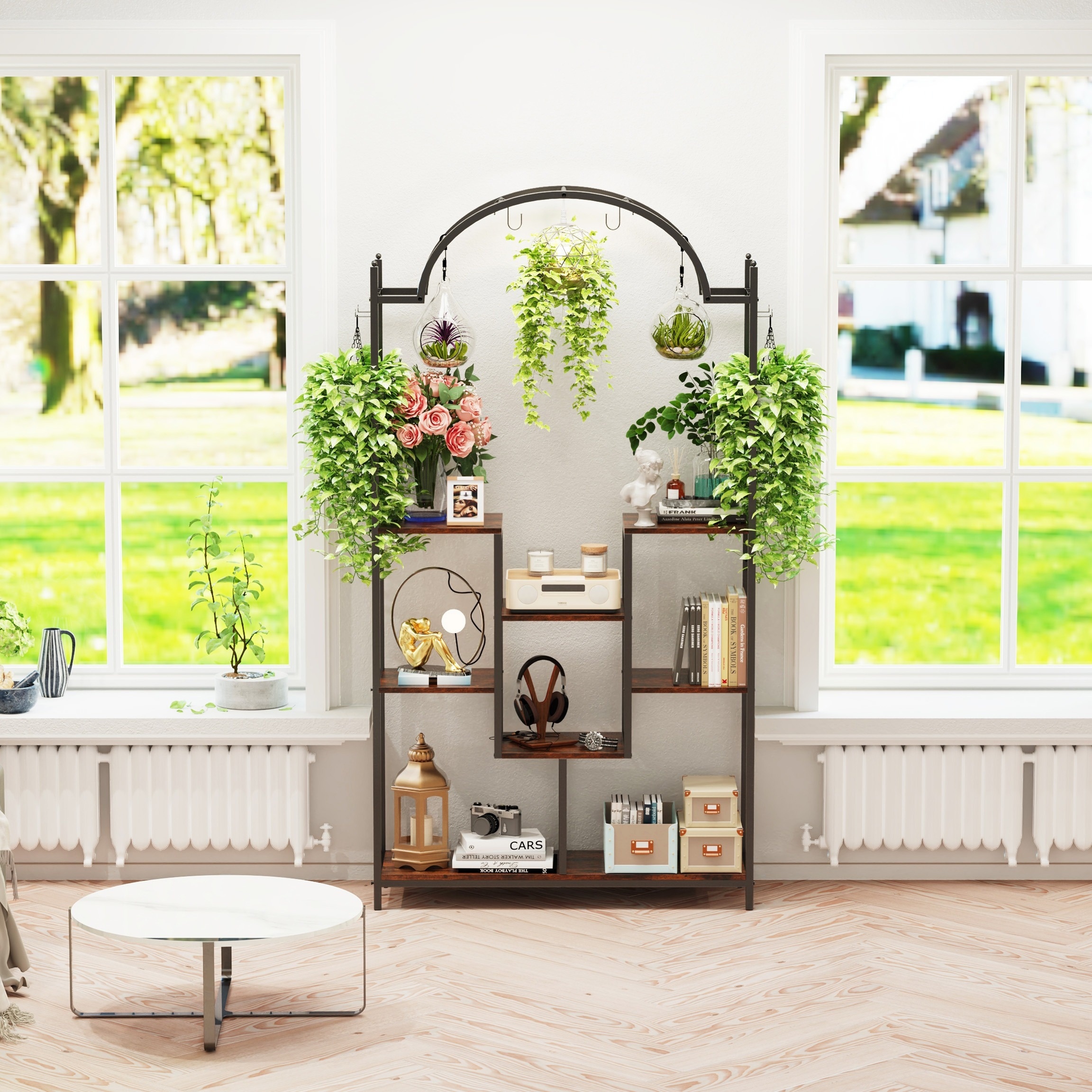 Versatile Display Options: The hanging hooks and multiple tiers give you flexibility in how you arrange and showcase your plants, flowers, and decorative items.