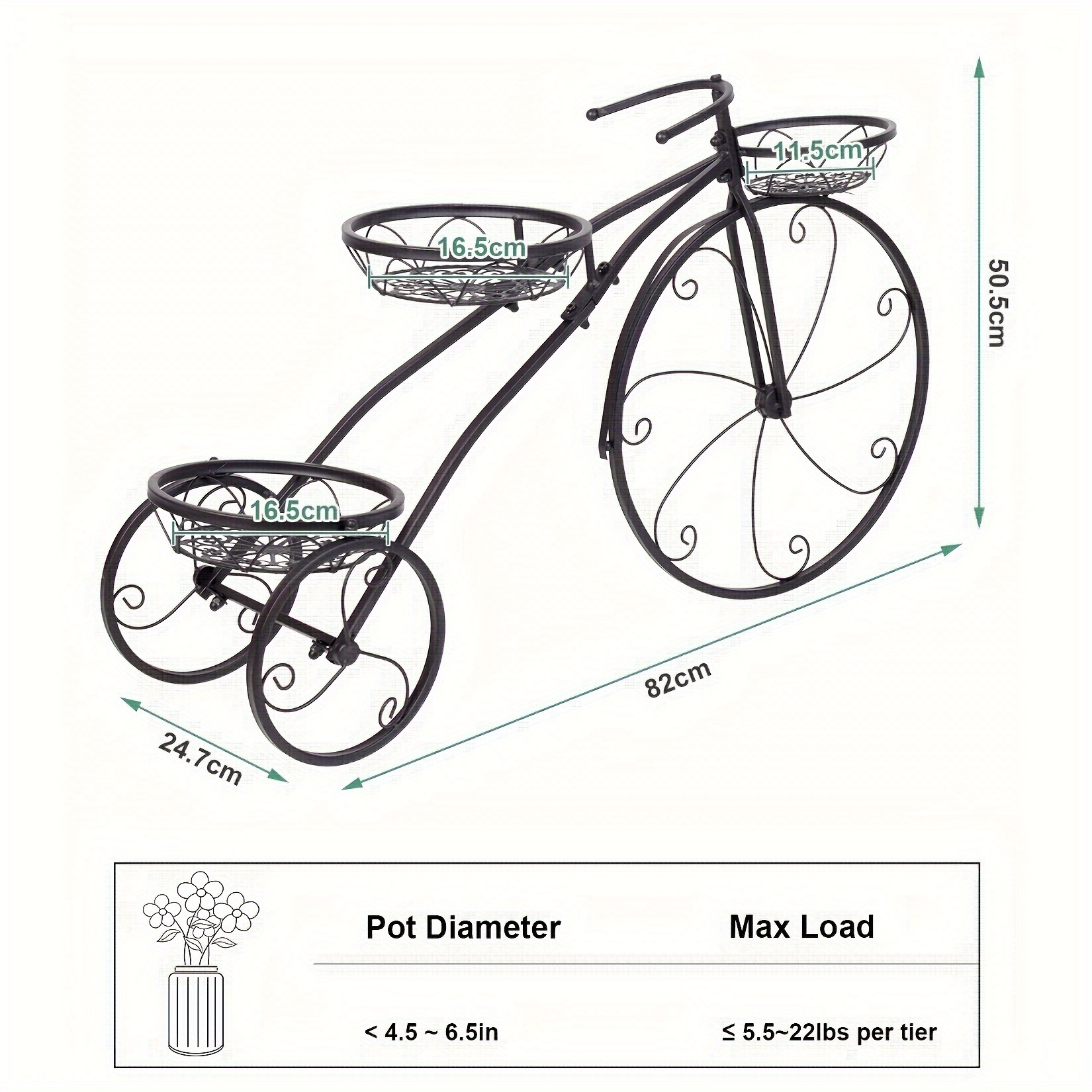 The Durable Solid Iron Construction Makes It Not Easy To Bend. The Painting Treatment Protects The Frame From Rust. The Hollow-out “basket” Is Great For Drainage And Ventilation When You Water The Flower. The Seamless Welds Protect The Frame From Cracking And Are Delicate Without Injuring Hands. It Supports A Total Weight Of 62lbs. The Small Pot Can Bear 6lbs, The Middle One Holds 6.5-inch Size Flowers And Weighs 22lbs, And The Third One Can Support 34lbsSpecifications: Model: 3 Tiers Type: Plant Stand Assembly: Assembly Required Shape: Bicycle Application Plants: Scindapsus Aureus, Succulents, Cactus Application Places: Living Room, Patio, Garden, Porch, Balconies Material: Iron Color: Black Load-bearing Capacity: 28kg/ 62lbs In Total Small Pot Holder: 2.5kg/ 6lbs Middle Pot Holder: 10kg/ 22lbs Third Pot Holder: 15.5kg/ 34lbs