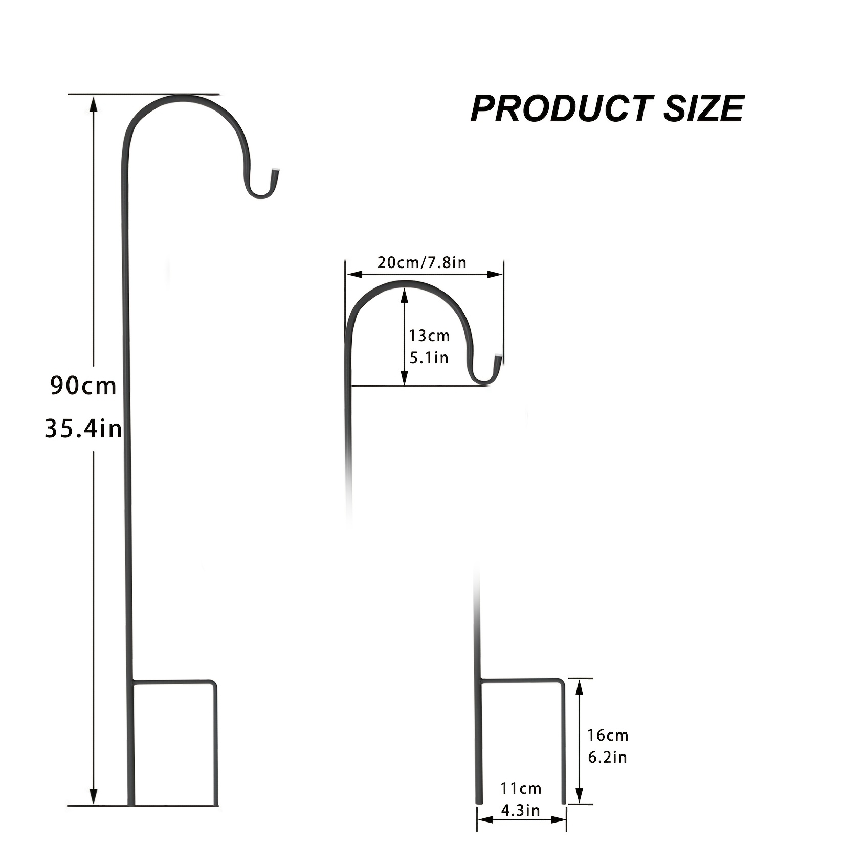 SpecificationMaterial: MetalColor: BlackSize: H: 90cm/35.4inPackage Size: 94x22.5x6.2cmWidth of Crook: 20cm/7.9inLoad-bearing of Each Hook: 5kg/11lbs.Net Weight: 2.5kg/5.5lbsType: Shepherd HooksApplication: Garden Lawn YardPackage Included:8 x Shepherd Hooks