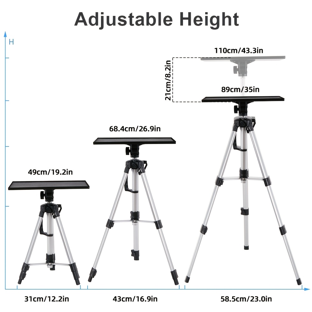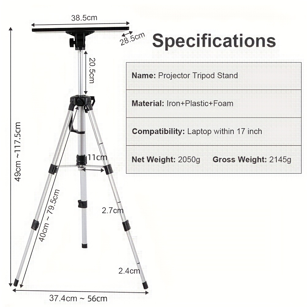 Specifications: Function: Tripod Stand Features: Height adjustable, with tray Room: Home, bedroom, living room, office Applications: Projector, laptop, DJ equipment Material: 60% Aluminum Alloy + 20% Plastic + 10% Foam + 10% Iron Color: Black + Silvery