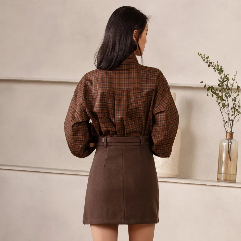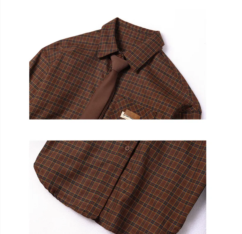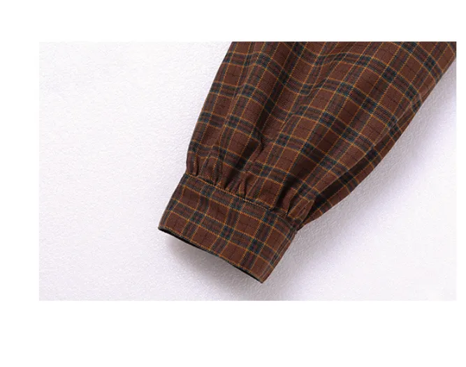 The Women's Preppy Plaid Tie Long Sleeve Shirt is designed with a classic plaid pattern that evokes a sense of timeless style. The bold checkered print in rich, earthy tones provides a versatile look that can be dressed up or down, making it suitable for various occasions. The addition of a tie at the front brings a modern, preppy flair to the traditional plaid shirt, allowing for a more personalized and flattering fit.