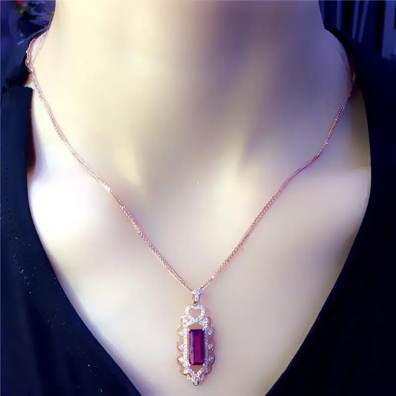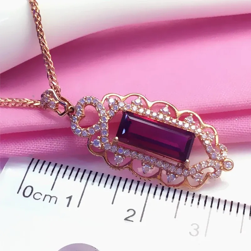 The pendant features a square-cut red stone, which can be made from ruby, garnet, or other red gemstones. Each stone is carefully selected for its vibrant color and high quality.