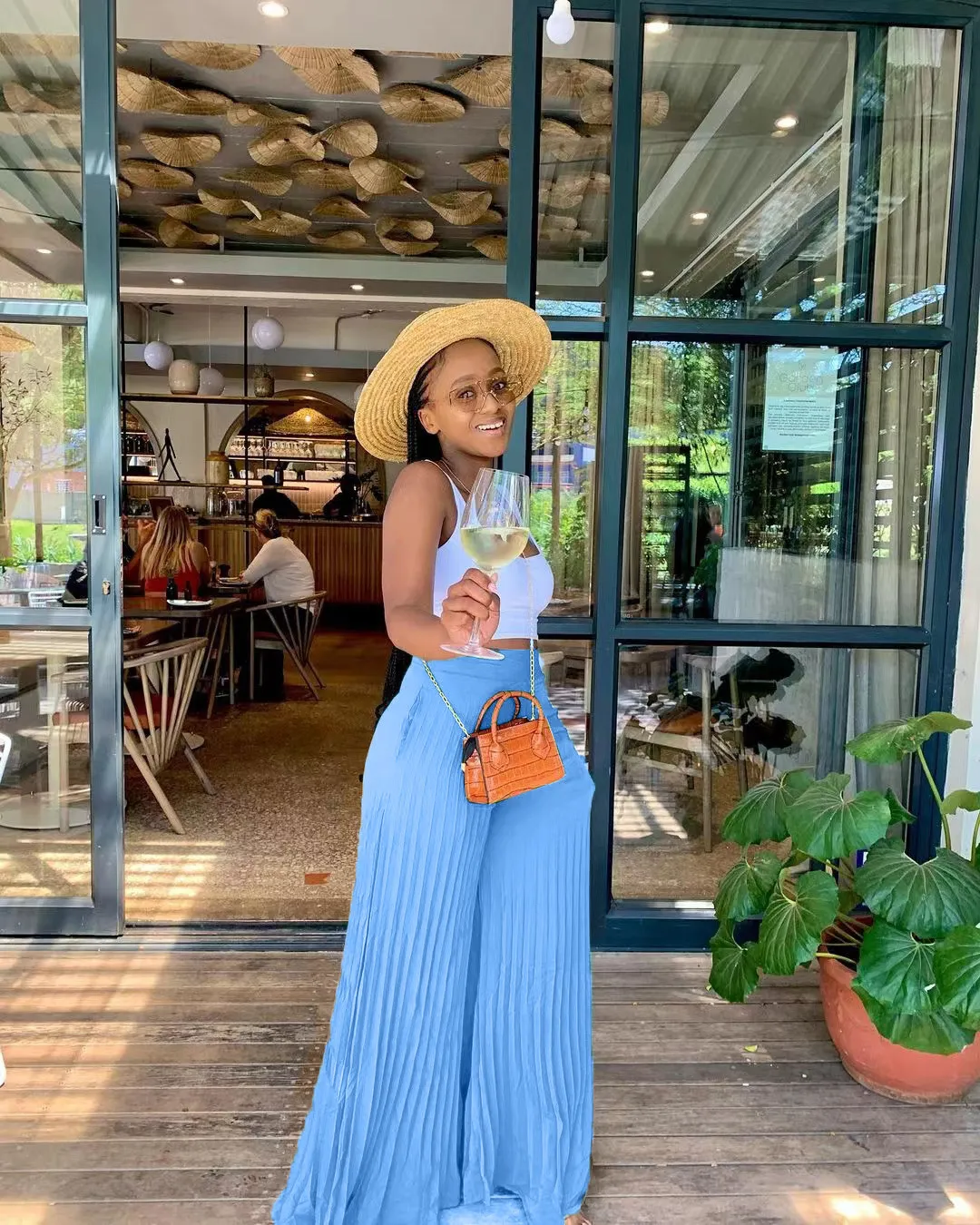 The pleated design adds an elevated touch of sophistication, transforming simple solid colors into a refined, fashion-forward look. The texture also enhances the pants’ drape, contributing to their elegant flow.