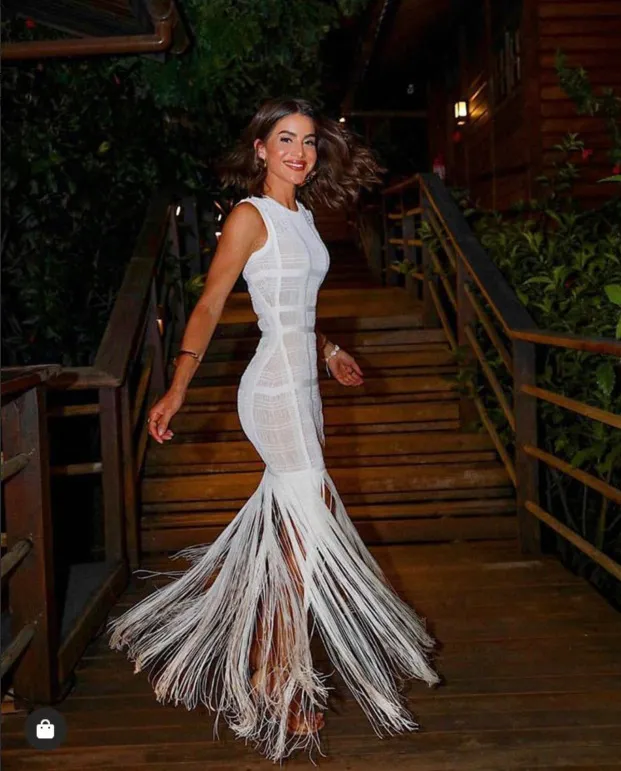 The top is designed to complement the skirt seamlessly, creating a balanced proportion that enhances the natural shape of the body. Tassels are placed to add visual interest and fluidity, catching the light and creating gentle motion as you walk or dance. This makes the dress especially striking in social settings where movement and presence matter.