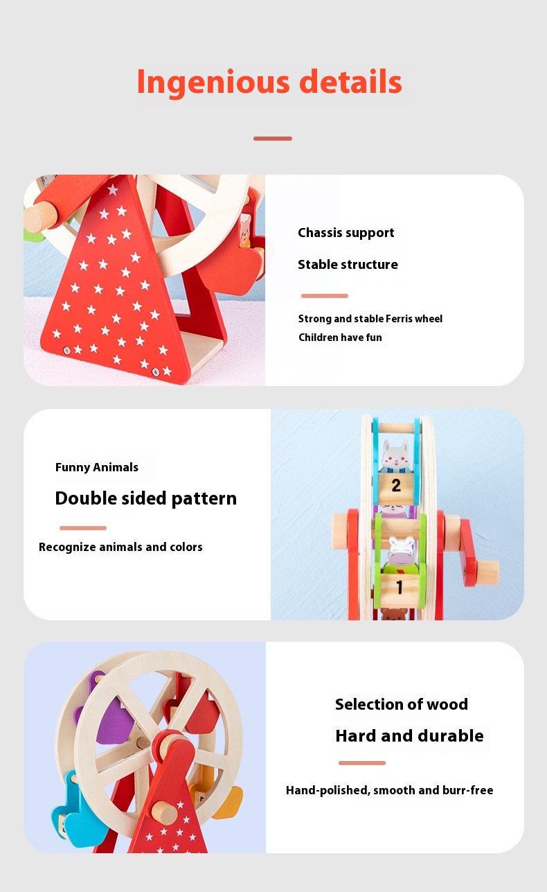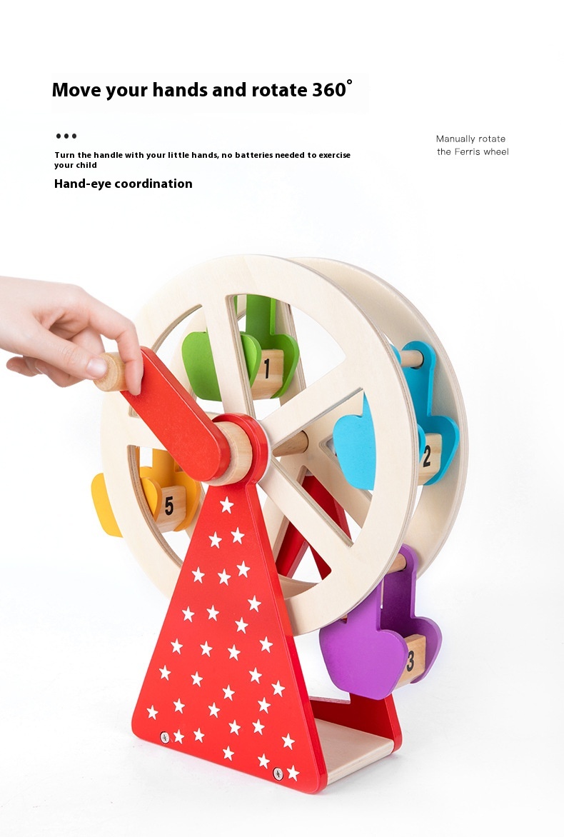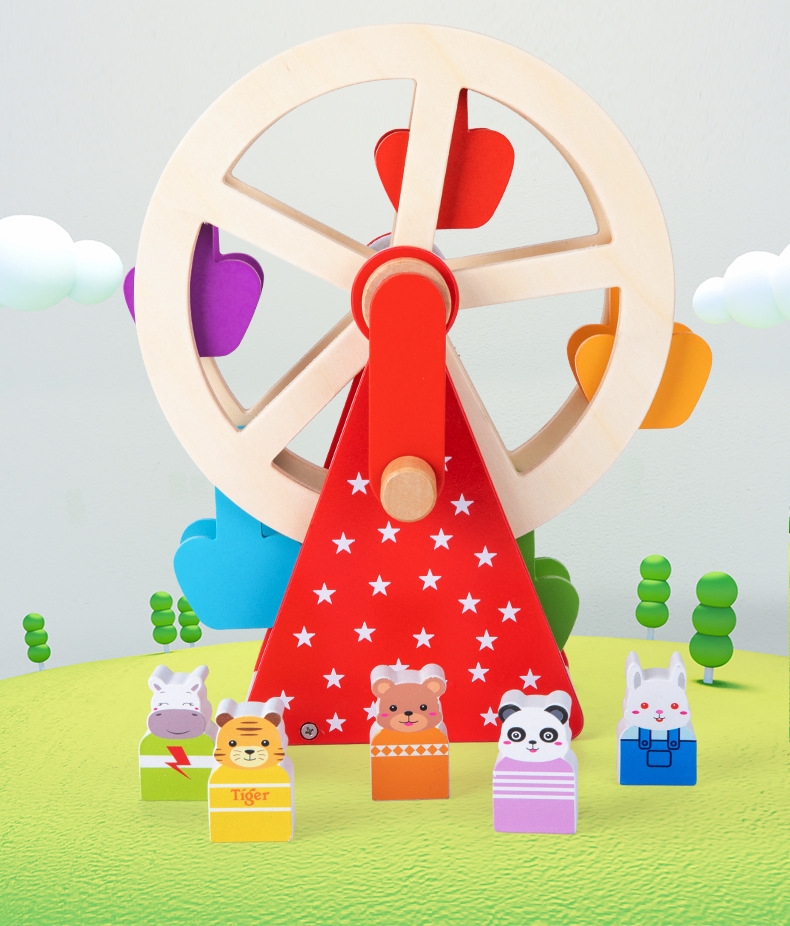 Early childhood education relies heavily on hands-on, sensory experiences, and the Wooden Animal Hand Ferris Wheel excels in providing just that. Here’s how this toy contributes to your child’s development: