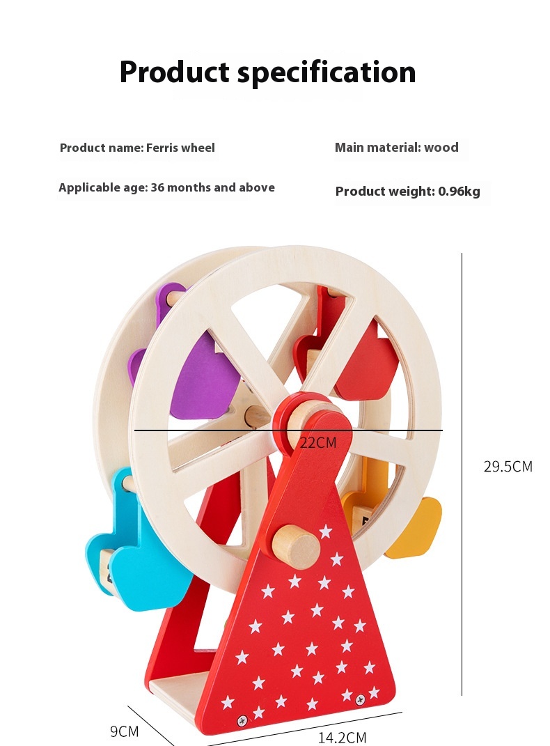 Ideal for babies, toddlers, and young children, this Ferris wheel toy is designed to stimulate creativity and cognitive skills in the early stages of childhood development. Whether it’s used at home, in a daycare, or as part of an early childhood learning program, this toy will become a treasured part of a child’s playtime routine.