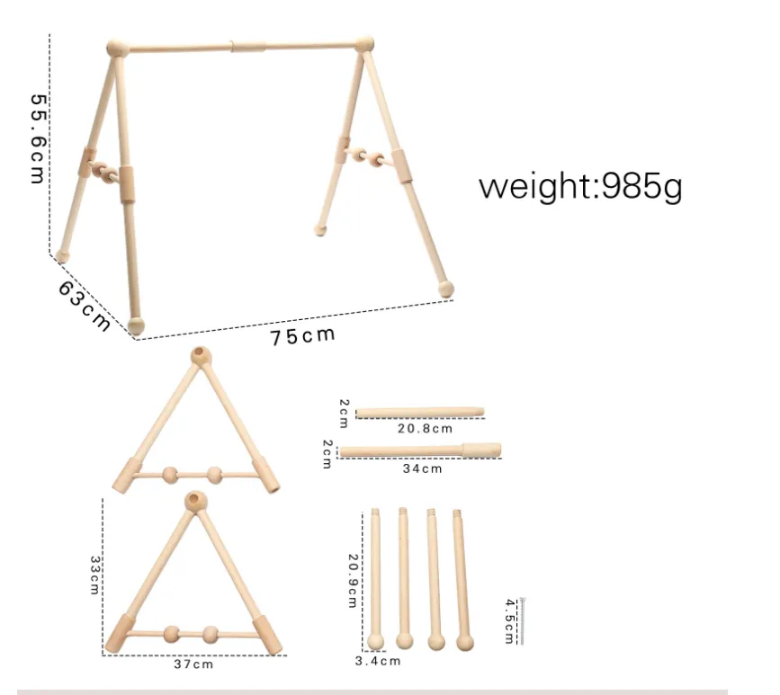 A wooden baby play gym is a free-standing frame, usually crafted from sustainably sourced beechwood, pine, or bamboo, designed to hold hanging toys, rattles, and sensory objects that babies can reach for and interact with.