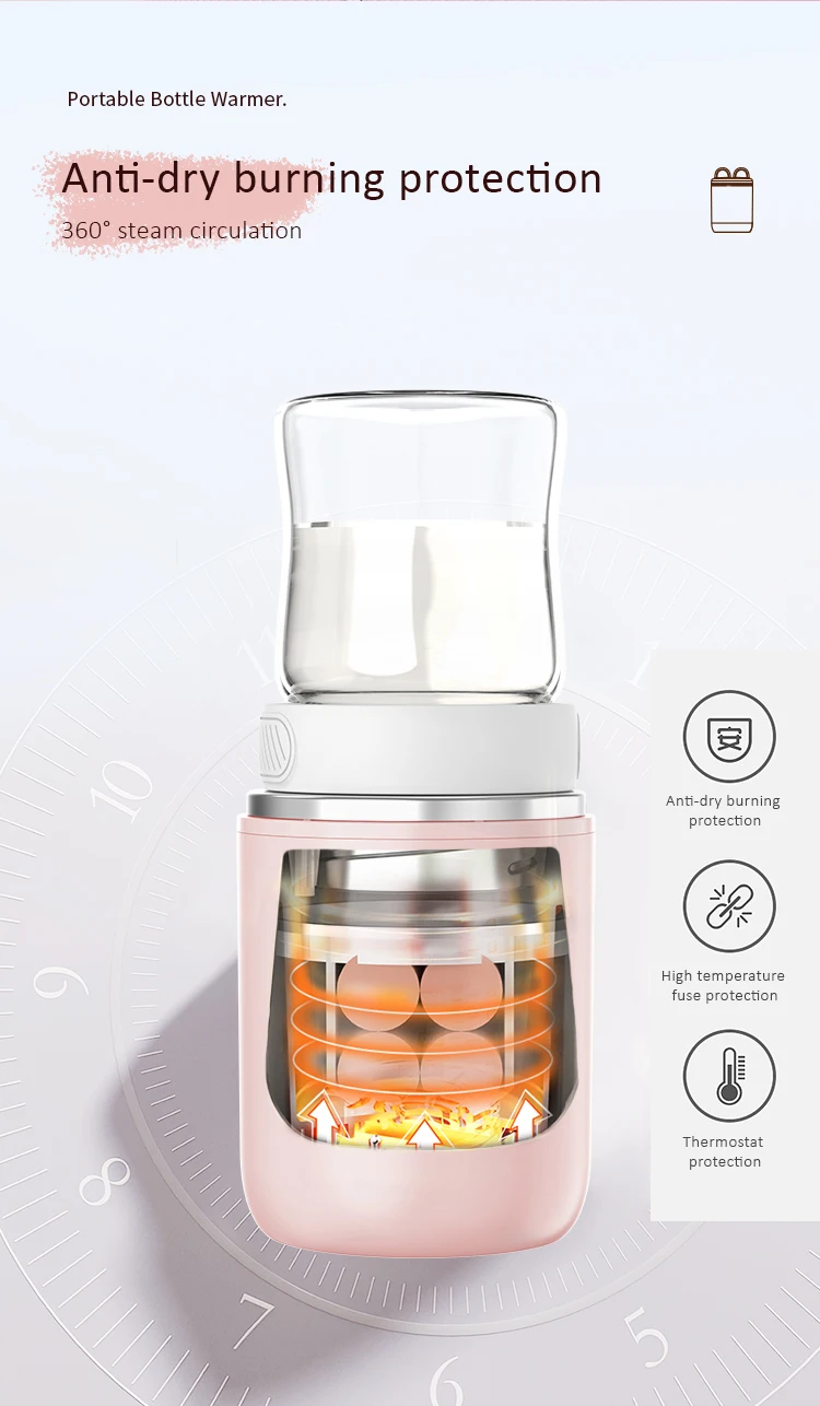 Portable for Travel: The portable bottle warmer for travel is perfect for warming baby's milk on the go. This portable bottle warmer with compact size (3.18x4.9in, 1.08 lb) makes it easy to fit into any bag. This travel bottle warmer is wireless and rechargeable, so you can charge it with any USB-C cable machine, like a power bank when you're outdoors. No need to find a power source