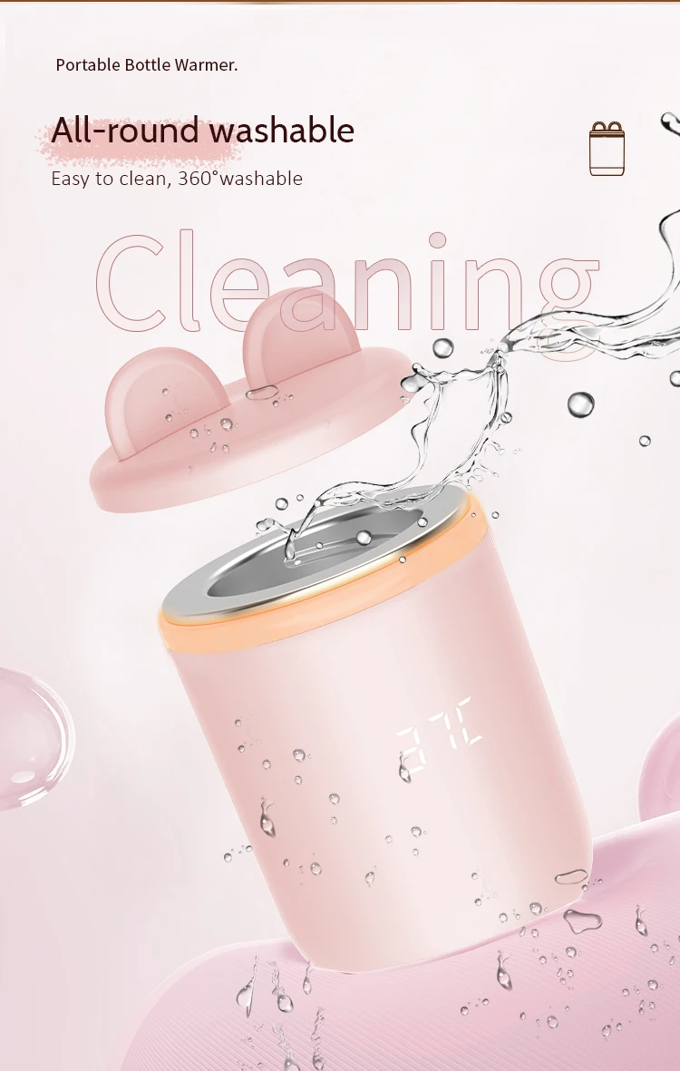 Leak-Proof & Easy Clean: The portable bottle warmer for breastmilk is designed to be leak-proof and water-proof, with silicone O-rings in the machine and adapters. To avoid any leakage, make sure to use the correct adapter, place the O-ring properly, and secure it tightly. It's also waterproof with an IPX6 rating and has a waterproof charging buckle with a silicone seal. You can easily clean it with a faucet, but don't soak it in water.