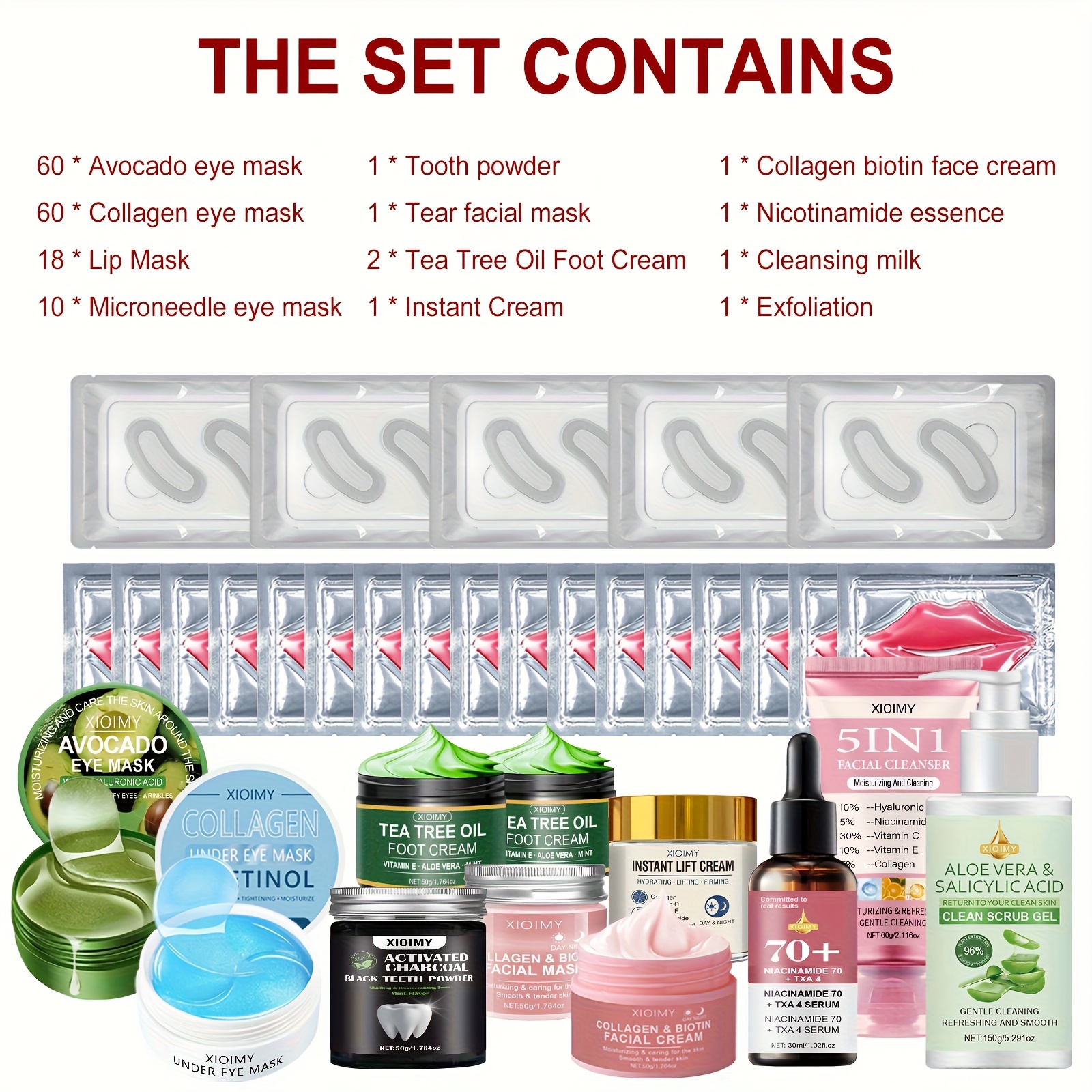 This gift set includes a diverse selection of XIOIMY bestsellers and essentials, such as facial cleansers, collagen creams, niacinamide serums, under-eye masks, lifting creams, foot care products, exfoliating scrubs, and targeted treatments. Together, these products support hydration, elasticity, tone refinement, cleansing, and overall skin comfort.