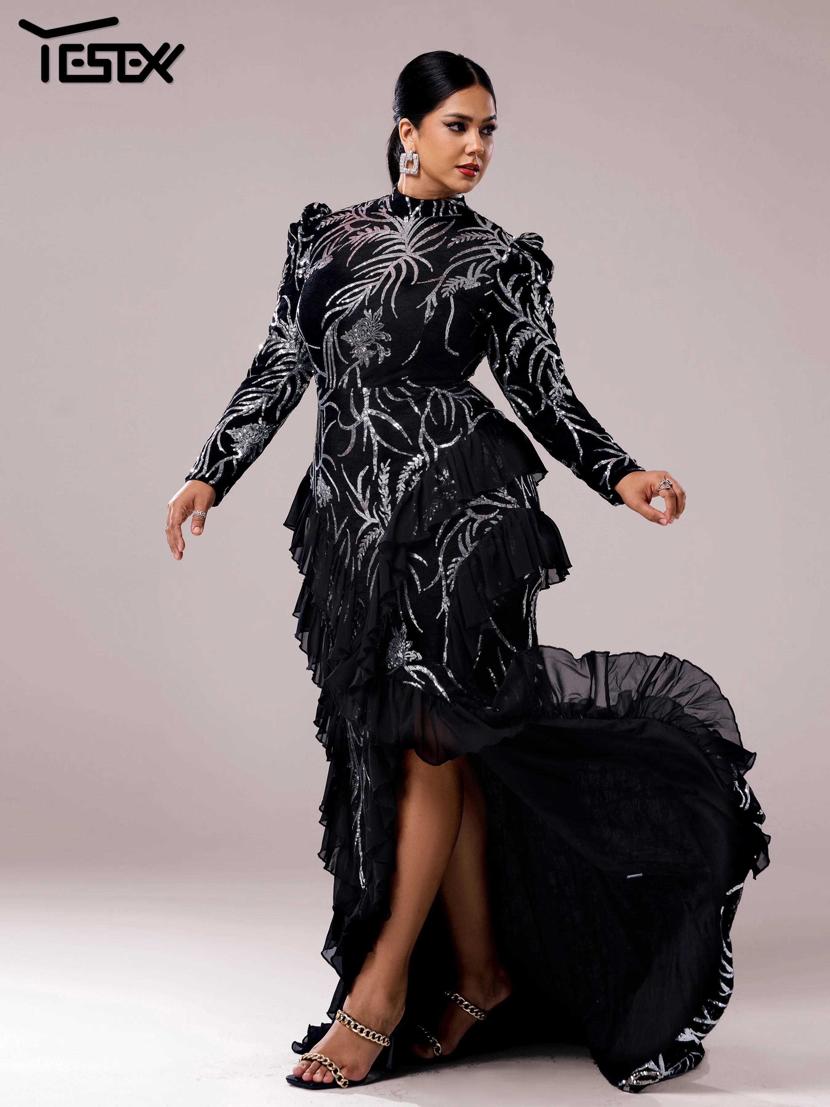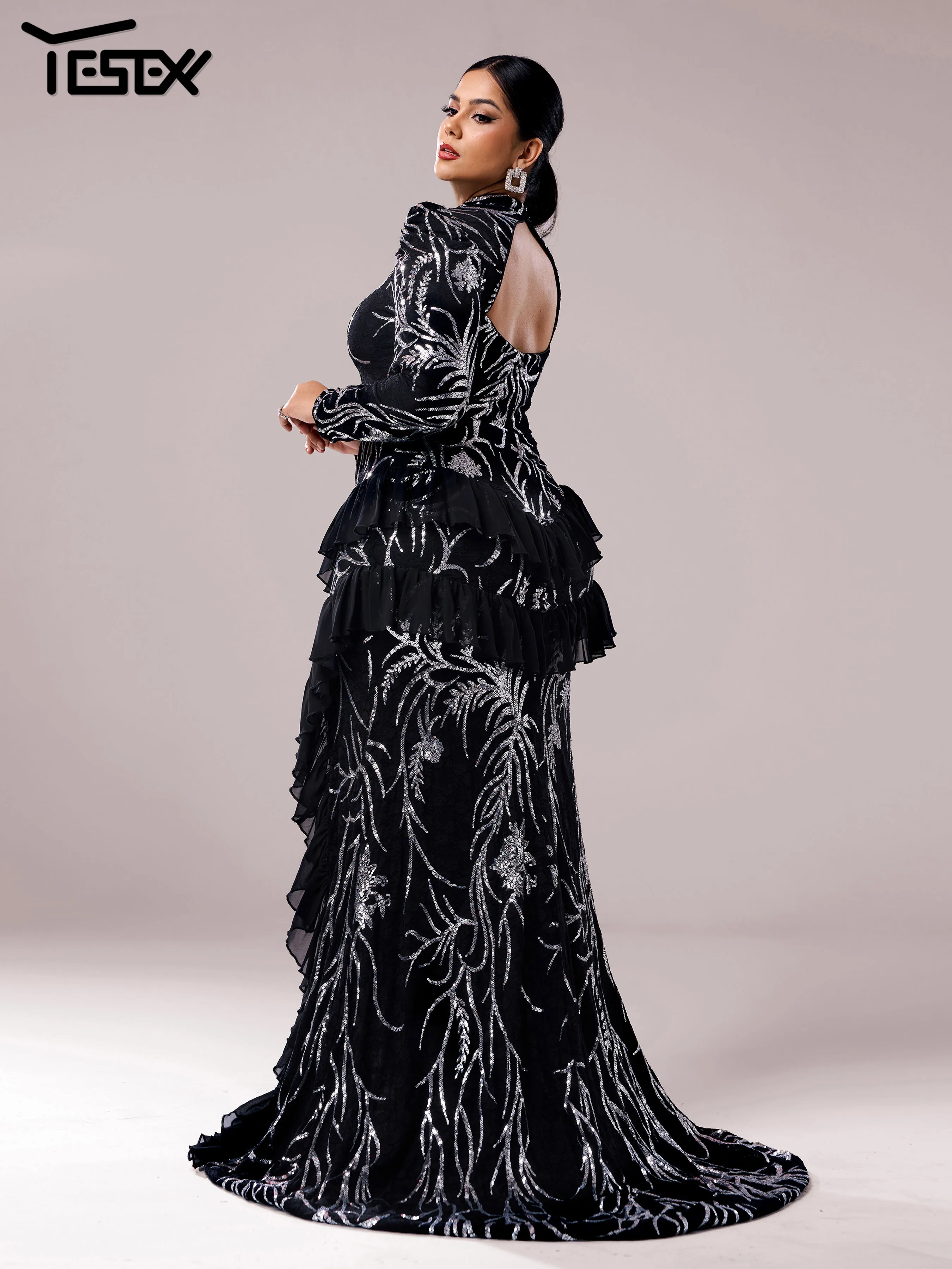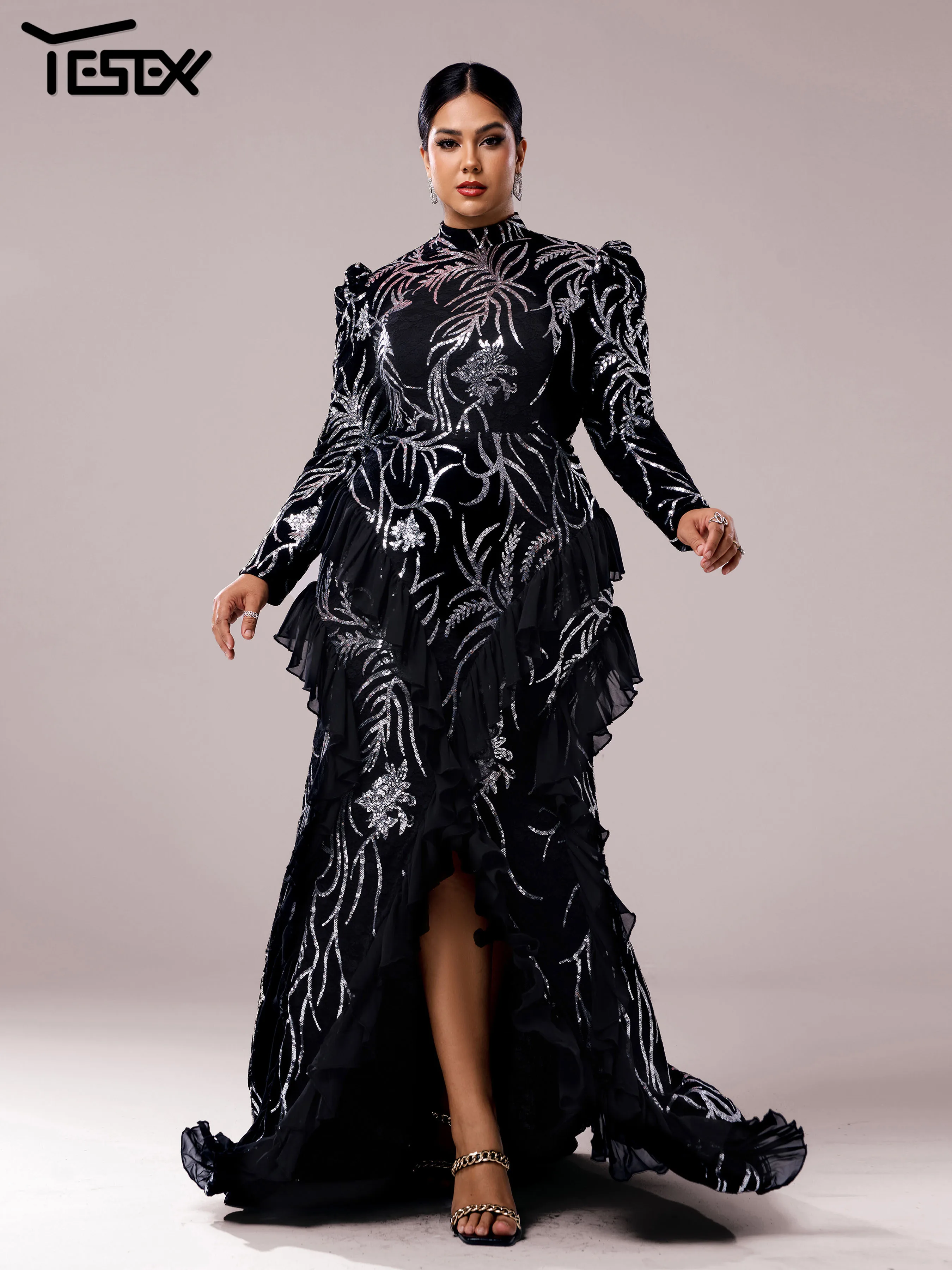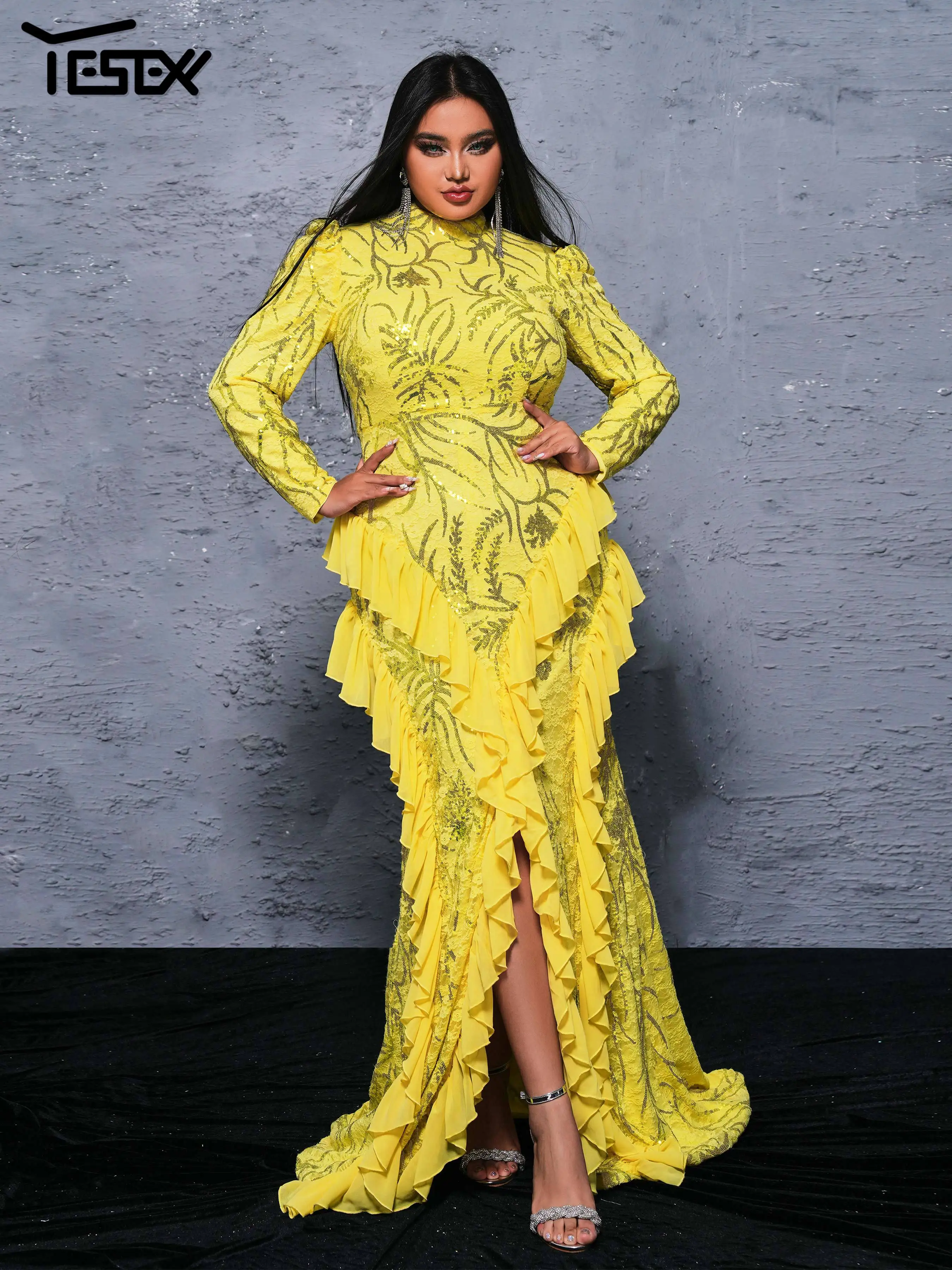 Yesexy Plus Size Elegant Beautiful Women Round Neck Long Sleeved Split Evening Gown Wedding Birthday Party Formal Occasion Dress