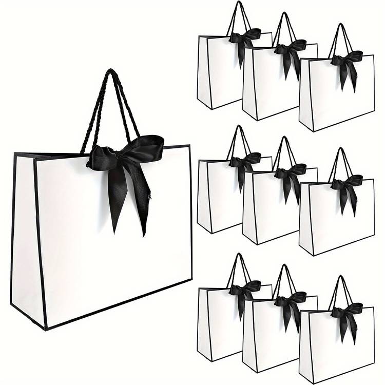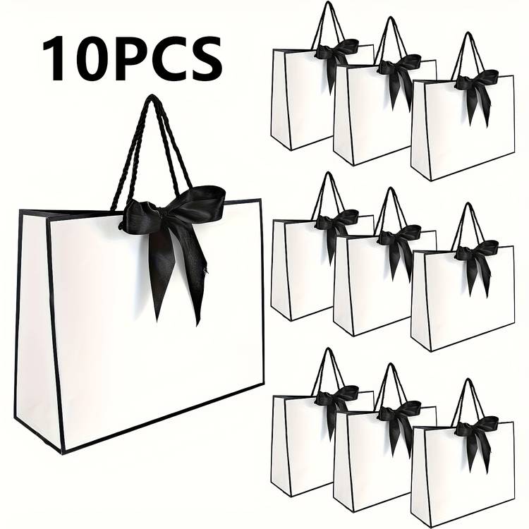 YIMUWN 10-Pack Elegant White Gift Bags with Satin-Like Black Ribbon Bows – Premium Multi-Size Paper Favor Bags
