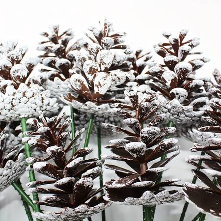 Each stem includes a textured faux pine cone coated with white brushed accents, creating a wintry snowy effect. The realistic evergreen sprigs add fullness and natural beauty to holiday decorations.