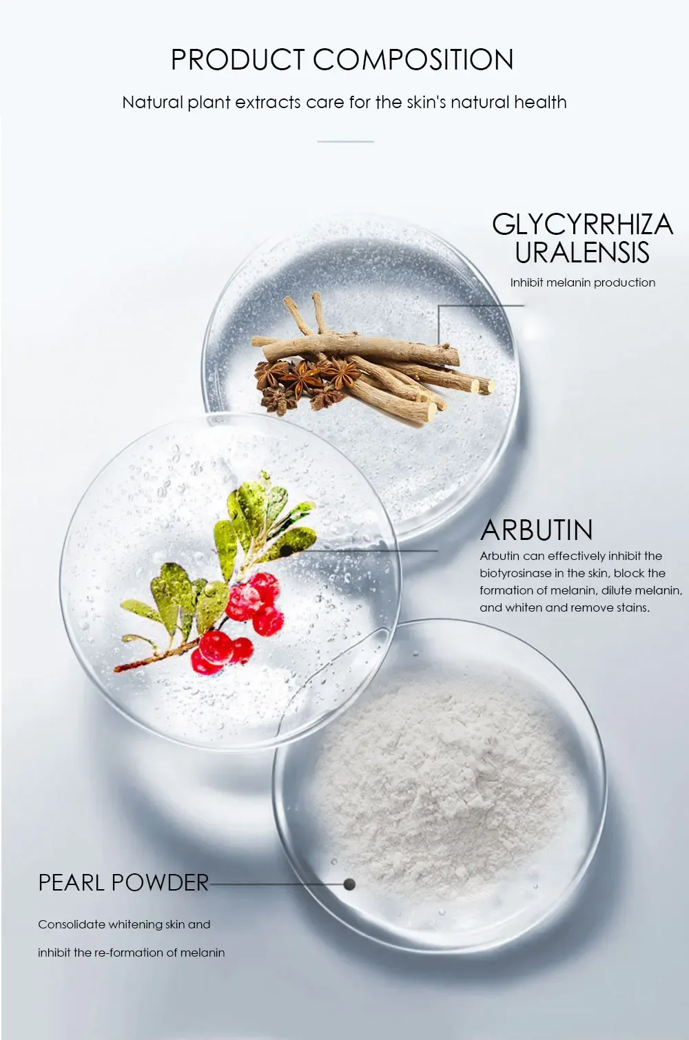 Consolidate and whiten the skin and inhibit the formation of melanin.