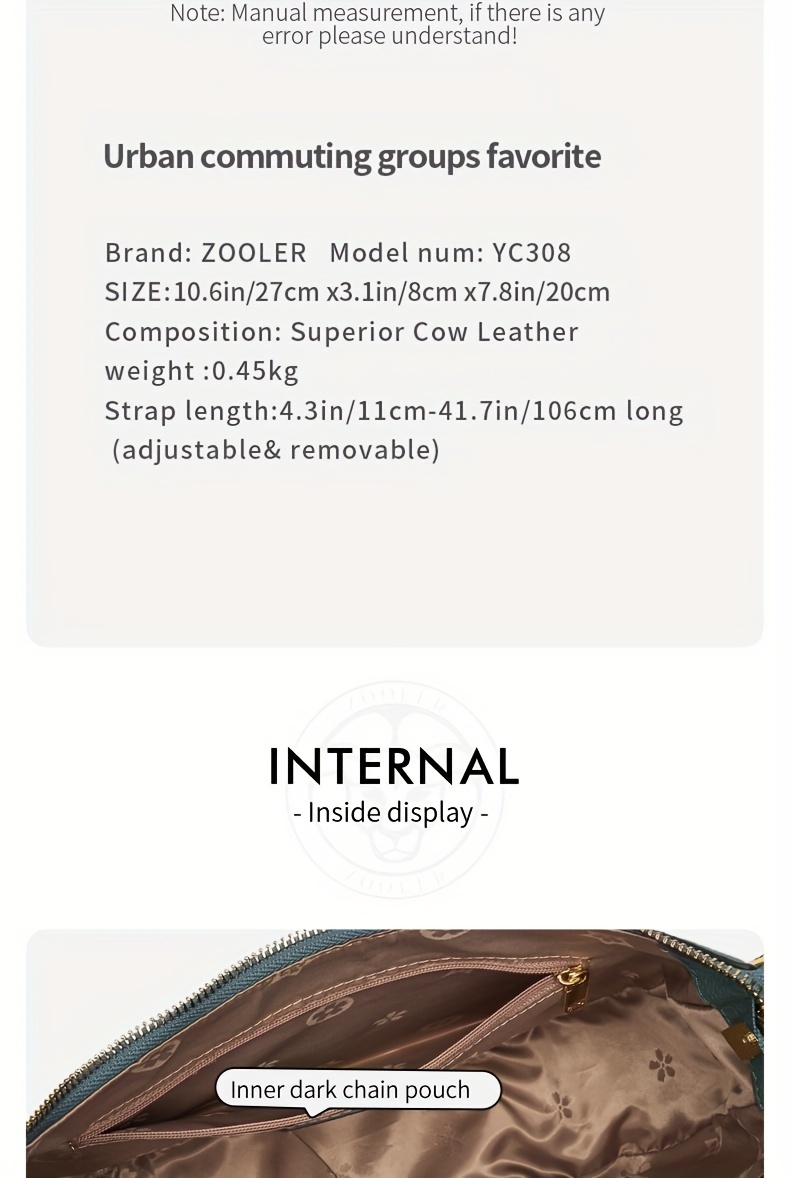 The ZOOLER Premium Top-Grain Genuine Leather Women's Handbag is a blend of luxury and function, designed for women who appreciate both style and practicality. This large-capacity handbag features a sleek, timeless design that complements a variety of looks, making it perfect for a wide range of occasions. Whether you're commuting to work, traveling for leisure, or heading out for a social event, the New Moon Bag ensures that you stay organized and chic.
