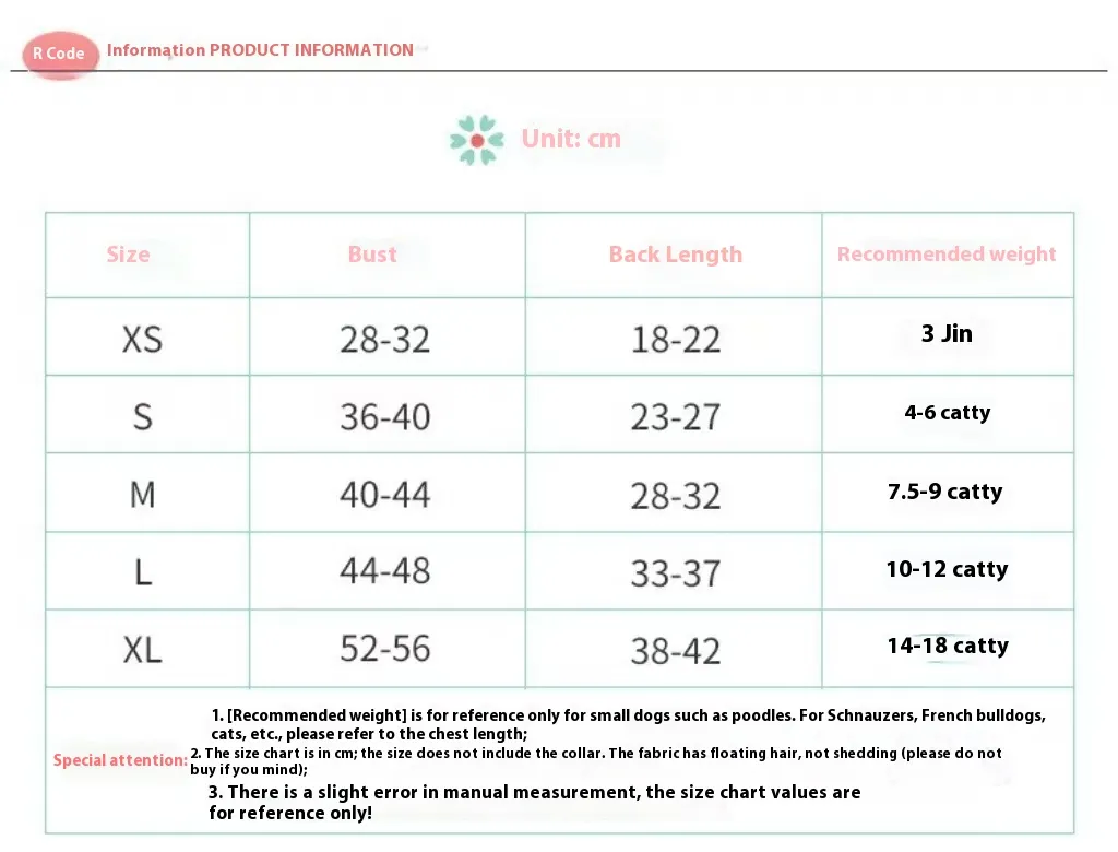 circumference 42cm, back length 30cm, 3.50 kg-4.50 kg, L chest circumference 46cm, back length 35cm, 5.00 kg-6.00 kg, XL chest circumference