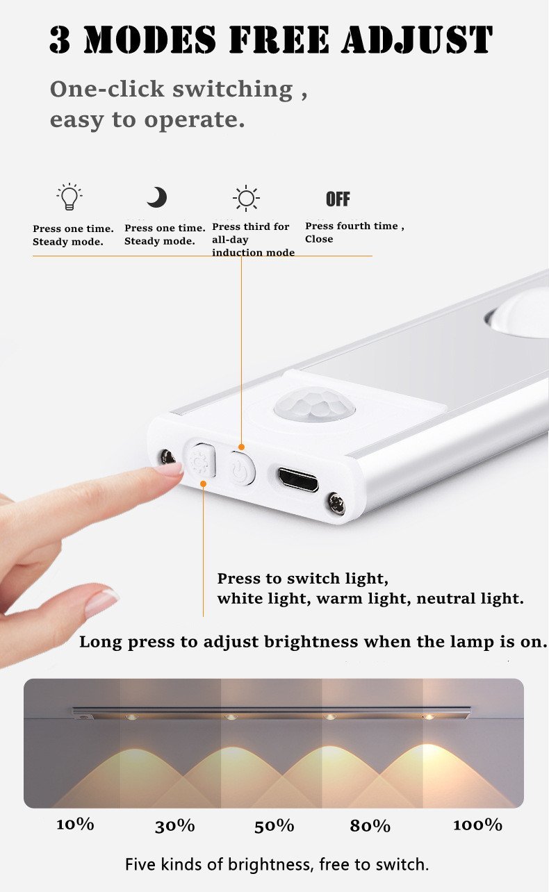 ❤️【3 Working Modes Adjustable】: These stick on closet lights have a 3 mode switch which is On-Off-G to set it always ON,Off or Motion Sensor mode. Therefore, you can used these closet lights as normal night light for closet/cabinet/drawer or motion sensor light.under G mode and dark environment, these under cabinet lights will automatically senses human motion within 10ft/120°range and shuts off automatically after 25 seconds of no movement.