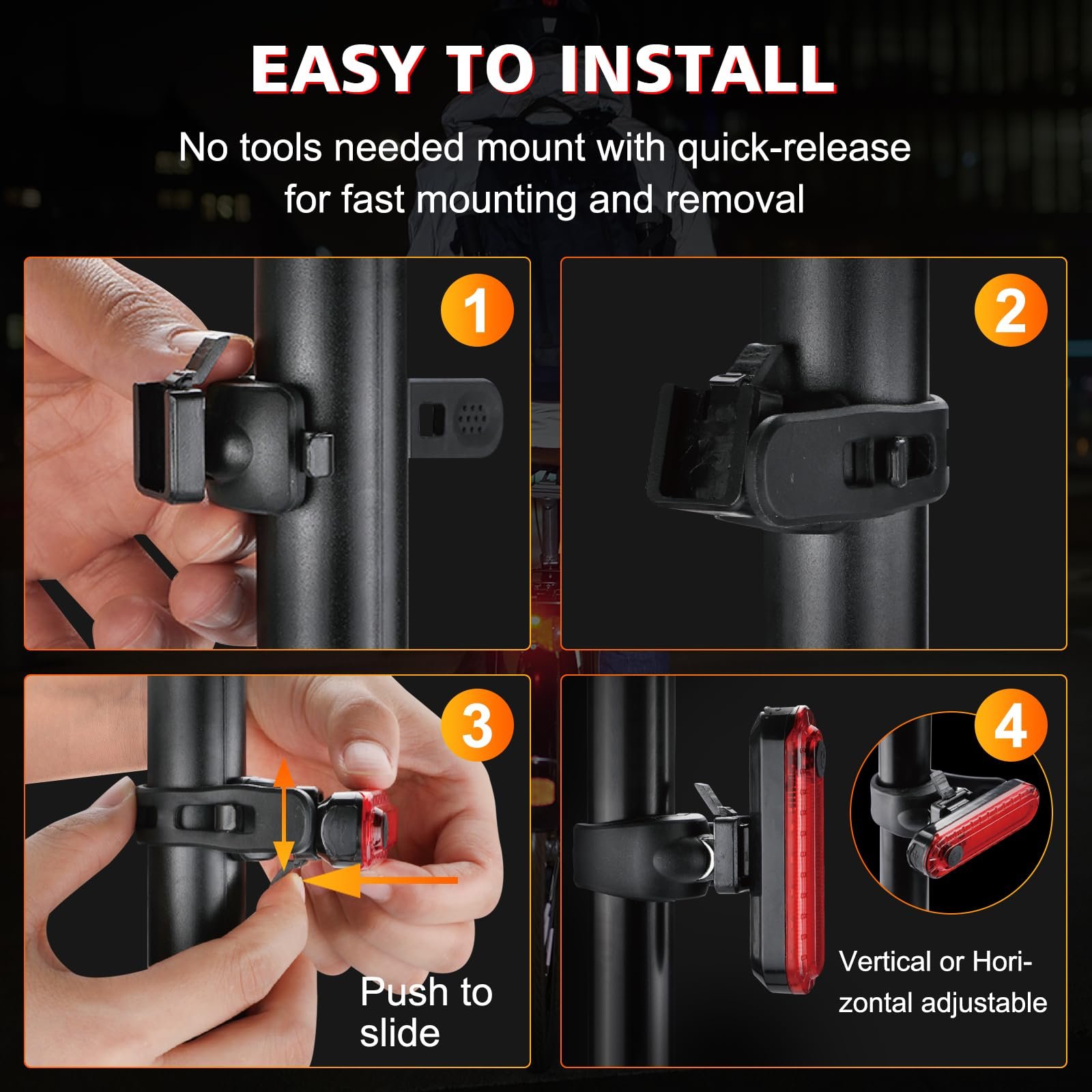 With a convenient one-touch dismount button, you just need to slide the light on & off the mount without removing the whole mounting bracket. The silicone mount strap for Taillight is designed with four openings that tightly fit around most size handlebars and seat posts.
