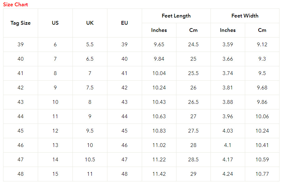 Size: 38, 39, 40, 41, 42, 43, 44, 45, 46, 47, 48
